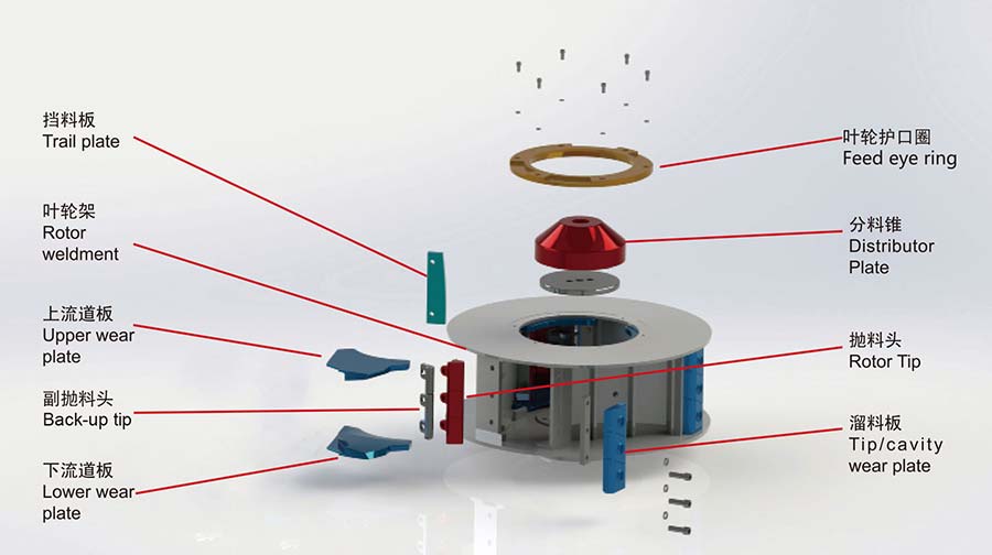 中心進料伴隨環(huán)形瀑落進料(“石打石”整型):物料落入制砂機進料斗,再經(jīng)環(huán)形孔落下,被分料盤分成兩股料,一股經(jīng)分料盤進入高速旋轉(zhuǎn)的轉(zhuǎn)子葉輪,另一股從分料盤四周落下。進入葉輪的物料,在葉輪內(nèi)被迅速加速后高速拋出,其加速度可達數(shù)十倍重力加速度,然后高速從甩輪內(nèi)拋出,首先同由分料器四周自由落體的另一部分物料沖擊破碎,然后一起沖擊到渦流腔內(nèi)渦流襯層上,被物料襯層反彈,斜向上沖擊到渦流腔的頂部,又改變其運動方向,偏轉(zhuǎn)向下運動,又與從葉輪流道發(fā)射出來的物料撞擊形成連續(xù)的物料幕。這樣,一塊物料在渦流破碎腔內(nèi)受到兩次至多次幾率撞擊、摩擦和研磨破碎作用,被破碎的物料由下部排料口排出。