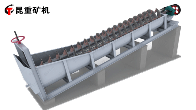 LXD系列螺旋洗砂機(jī)是借助固體顆粒的比重不同,因而在液體中沉降得速度不同的原理,進(jìn)行洗選的設(shè)備。轉(zhuǎn)子采用中心結(jié)構(gòu),螺旋葉片安裝在中心軸上,有減速機(jī)連接到中心軸上進(jìn)行轉(zhuǎn)動。工作時,物料由給料箱均勻給入,連續(xù)給主槽體中注入一定量的水,傳動部帶動螺旋軸以一定的速度旋轉(zhuǎn),迫使物料在槽體中翻轉(zhuǎn)滾動并向排料口運(yùn)動,細(xì)粒級物料和雜質(zhì)隨溢流水經(jīng)溢流堰排出,粗粒度物料由排料口排出,從而實現(xiàn)物料的洗選、分級、除雜和脫水。